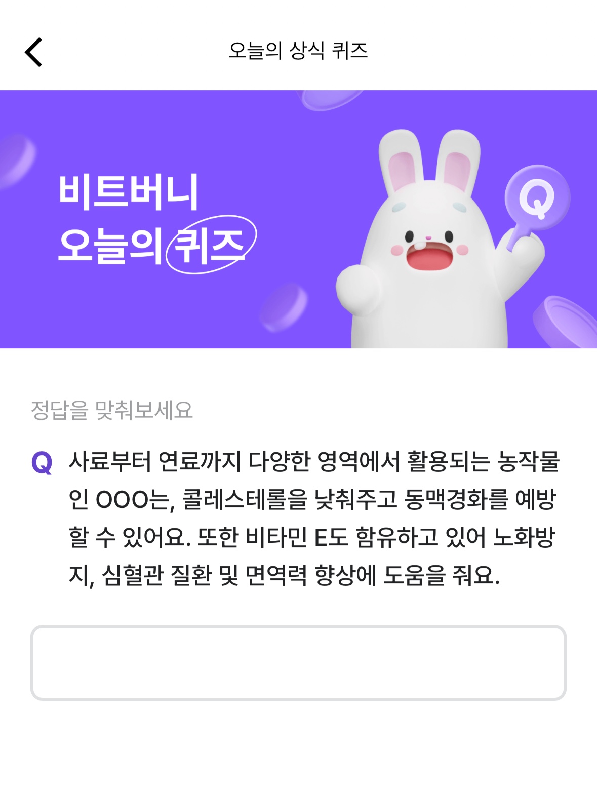 Q. 사료부터 연료까지 다양한 영역에서 활용되는 농작물인 ㅇㅇㅇ는, 콜레스테롤을 낮춰주고 동맥경화를 예방할 수 있어요. 또한 비타민 E도 함유하고 있어 노화방지, 심혈관 질환 및 면역력 향상에 도움을 줘요. 정답은?